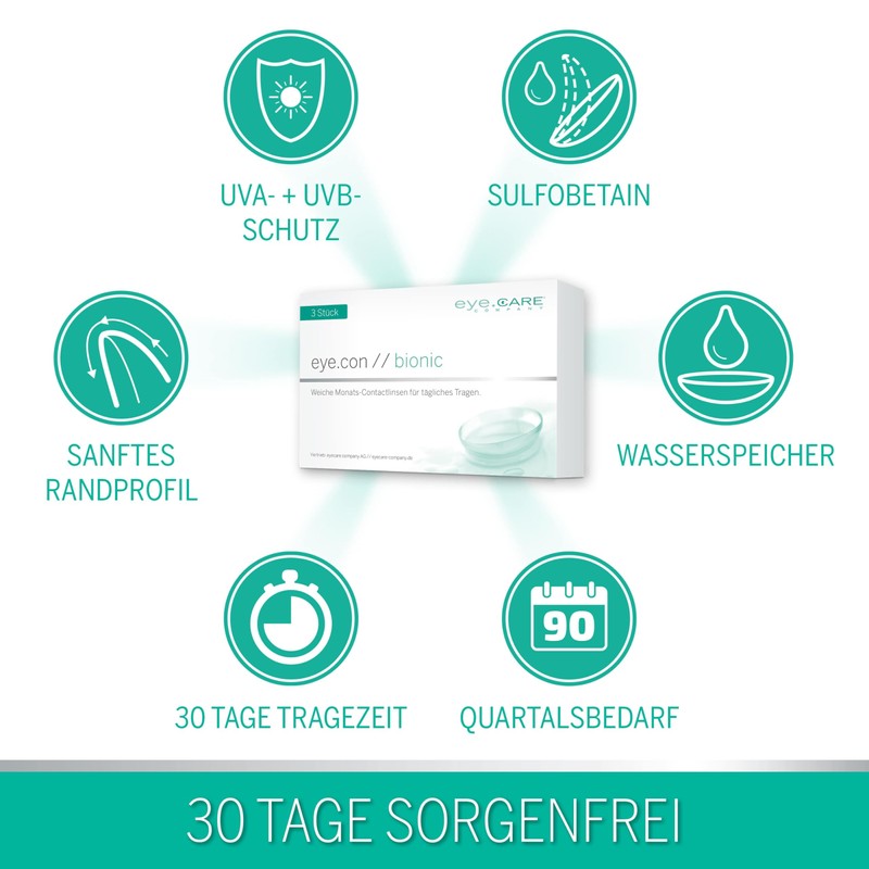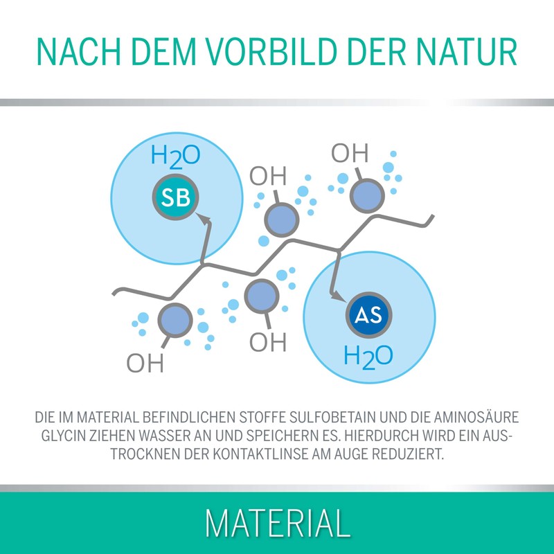 - Premium quality - Bio-hydrogel contact lens with water reservoir for optimal oxygen supply for one month. Especially suitable for dry eyes as no moisture is removed from the eye