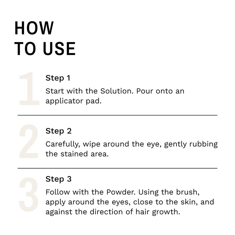 - TWO-STEP SYSTEM: Tear Stain Solution cleans the affected area and helps fight the root cause of the staining; apply with included Applicator Pads. Tear Stain Powder absorbs excess moisture and helps new tears. It is NOT a chalk or cover up, but a natural silk-like powder that safely keeps your pet’s eye dry, stain-free and full of luster. Apply Powder safely with the ProPowder Brush.