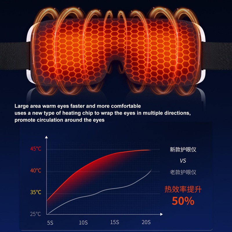 1、45°C Heat: The eye massager is applied with 45°C temperature sensitive hot compress. Intermittent heating is used to avoid discomfort caused by excessive temperature, so that you can enjoy the right amount. 2、New Heating Chip: The massage eye patch uses a new type of heating chip to wrap the eyes in multiple directions, promote circulation around the eyes, gently massage with micro tremor, relax the eye muscles, and massage with high frequency micro tremor to accurately and deeply relieve fatigue. 3、Multi Frequency Vibration: Double engine multi frequency vibration, about 100 to 120 times of different frequency vibration per second, regular massage of the acupoints around the eyes, to reproduce the vitality of both eyes. 4、Bluetooth Connection: The eye massager supports Bluetooth connection, and you can play your favorite books and music freely, enjoy massage and give consideration to work and life efficiently. 5、Multifunction: One eye protector is equal to one eye massager, hot compress eye cover and music player, you can comfortable listen to music, protecting bright eyes and get a good relax.