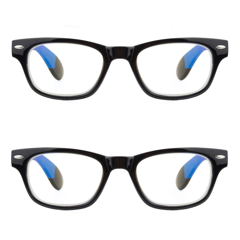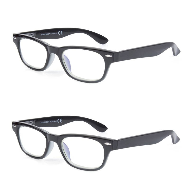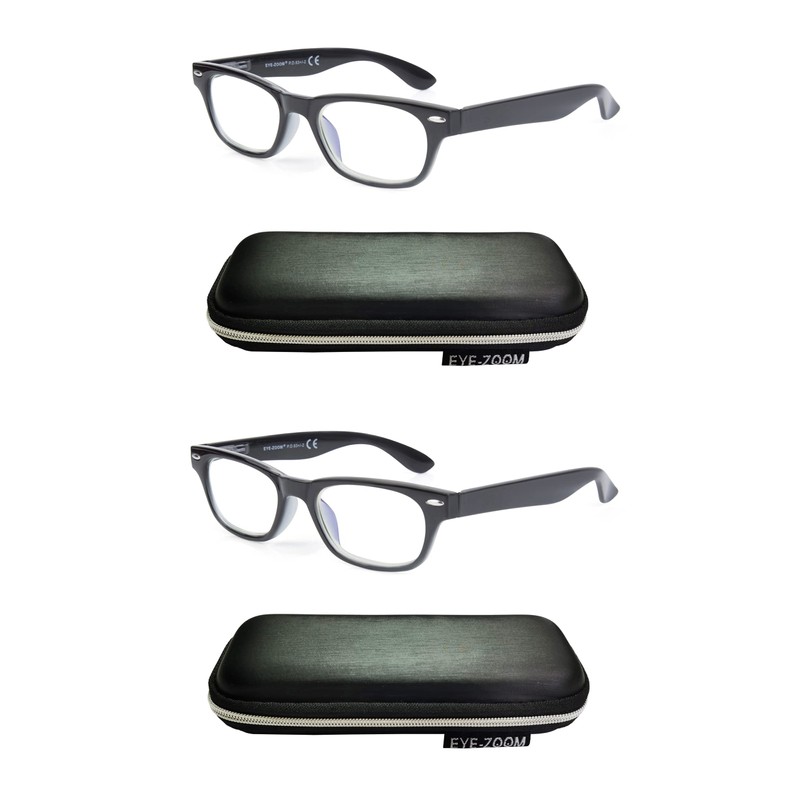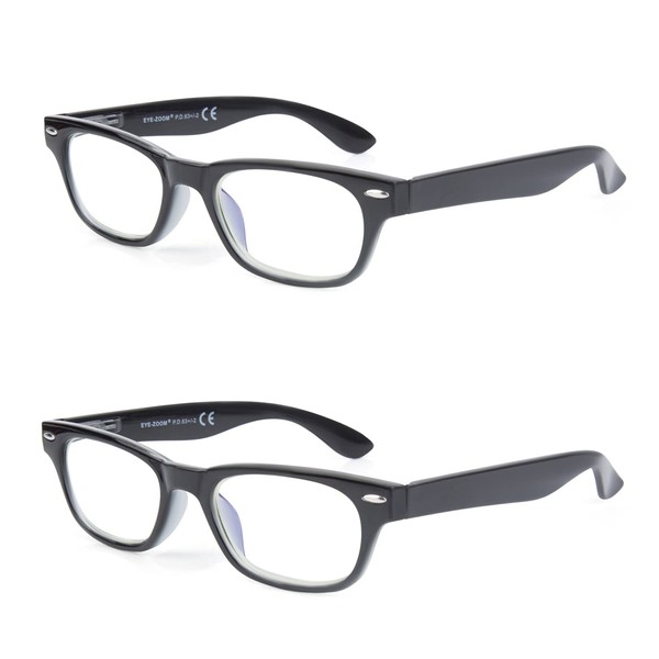 EYE ZOOM 2 Pack Unisex Blue Light Horn Rimmed Reading Glasses with Case, Black, +1.25