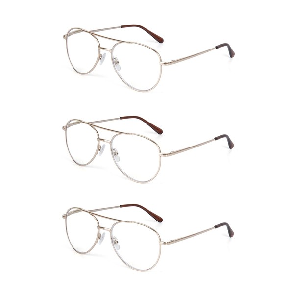 EYE ZOOM 3 Pack Aviator Style Metal Frame Blue Light Blocking Reading Glasses (Gold, +1.50 Strength)
