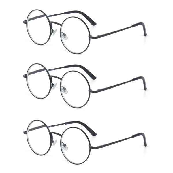 EYE ZOOM 3 Pack Metal Frame Round Reading Glasses with Spring Hinge (Black, 3.00 Strength)