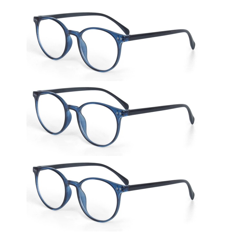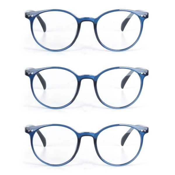EYE ZOOM 3 Pack Retro Round Plastic Frame Reading Glasses for Men and Women, Navy Blue, +2.00