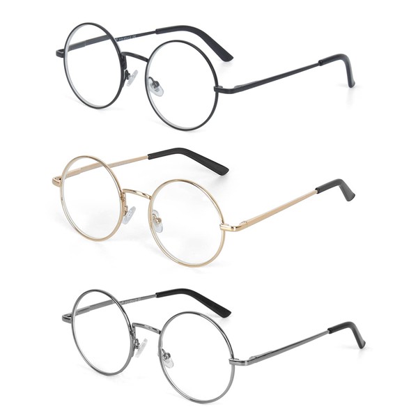 EYE ZOOM 3 Pack Round Metal Frame Blue Light Blocking Reading Glasses (Black, Gold and Gunmetal, +3.00)