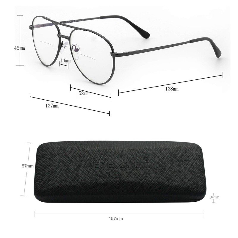 - EYE ZOOM unisex aviator style metal bifocal reading glasses. Classic aviator style, look good on any face shape. Spring-hinged temples, help glasses fit your face. Great for indoor and outdoor use.