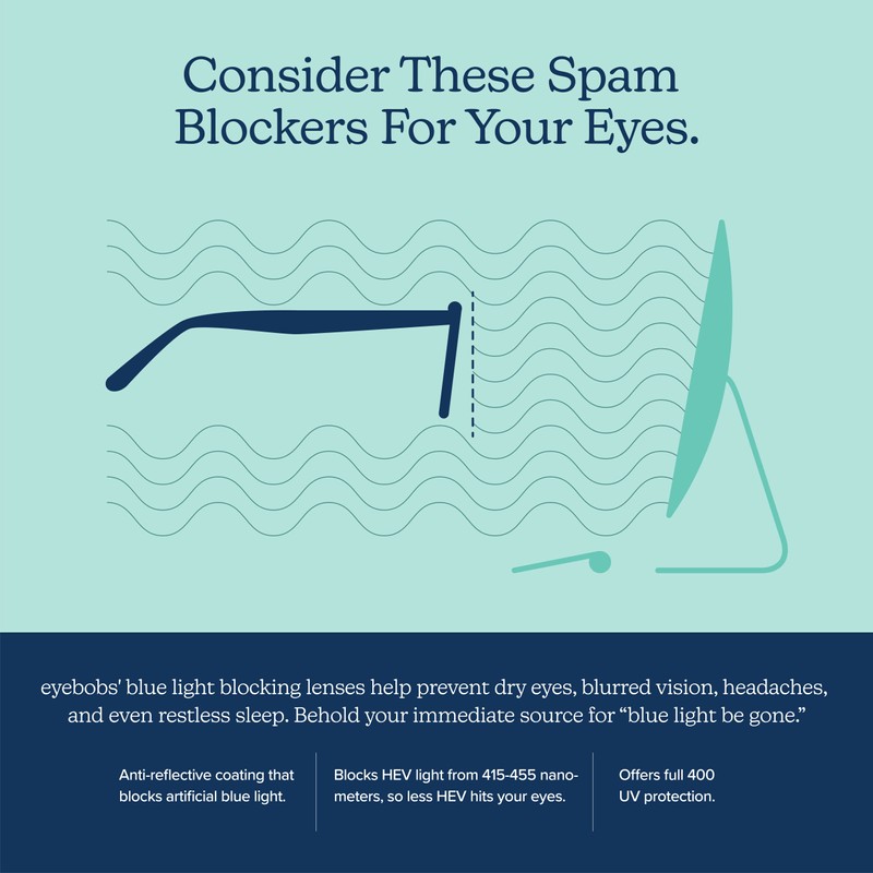 • LENS MATERIAL: Blue light blocking glasses are made with a lens that has an anti-reflective coating that blocks, you guessed it, blue light. More specifically, they block artificial blue light. The lenses remove blue light frequencies from the visible light spectrum, meaning less HEV hits your eyes and stops the need to rub, wish, toss, and even turn. We guess you could consider them spam blockers for your eyes.