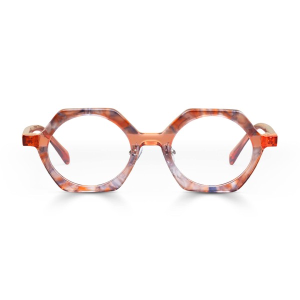 eyebobs Paradox Premium Readers for Women and Men | Hexagonal Eye Glasses | Orange Pattern Front with Orange Crystal Temples | 0.00
