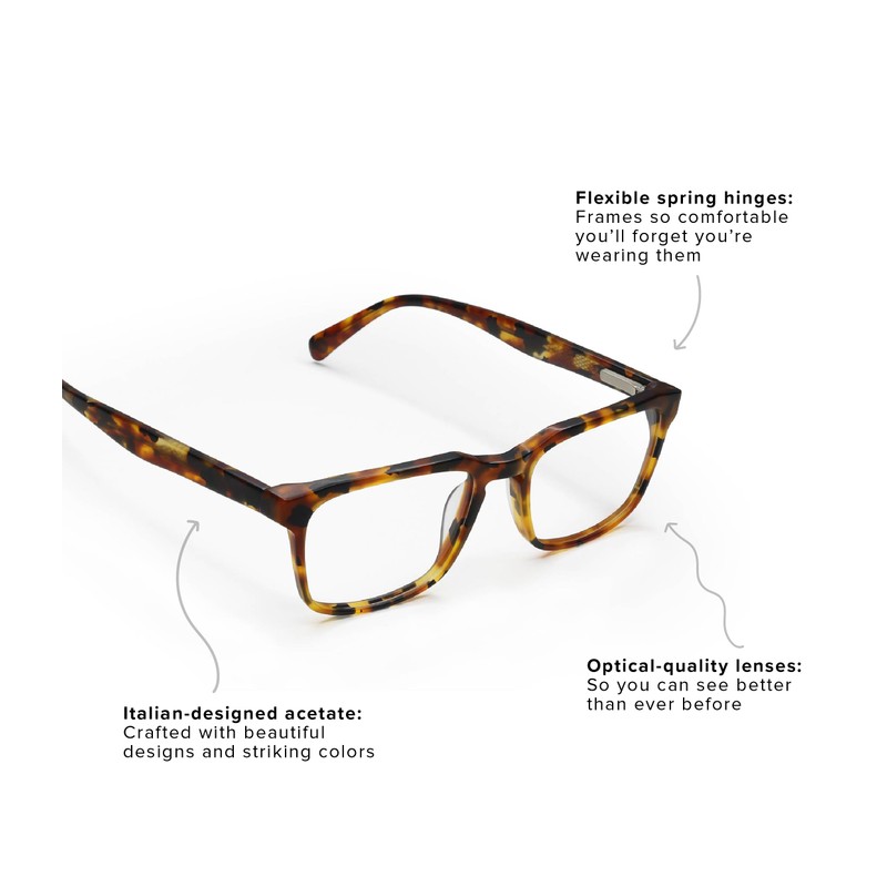 - PREMIUM FRAME MATERIAL: We painstakingly select the very best materials, like luxury acetate, comfortable spring hinges, and best-in-class, optical quality lenses.