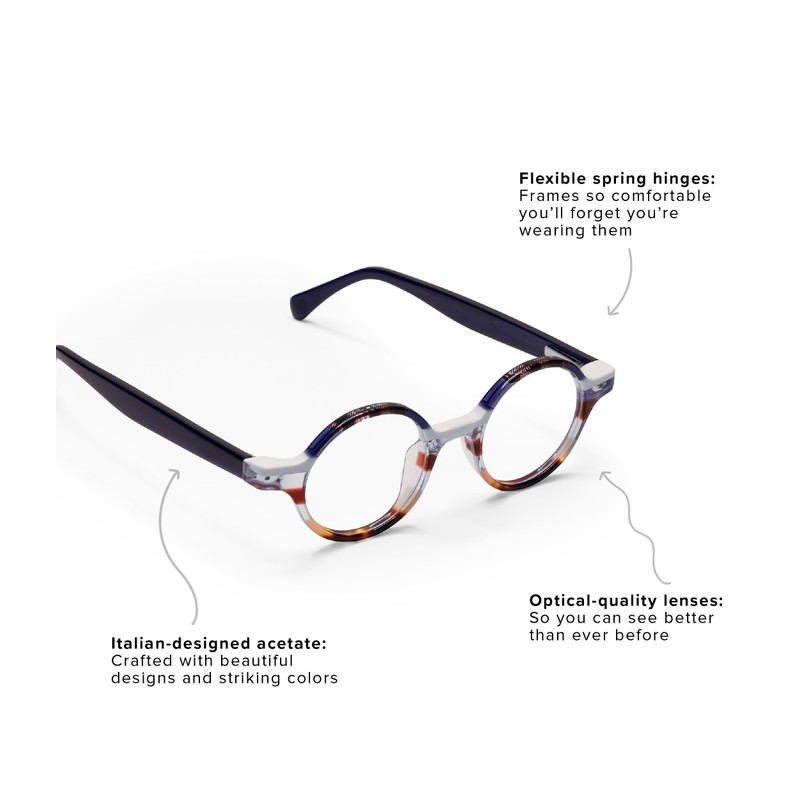 eyebobs Wisecracker Premium Readers for Women and Men | Round Eye Glasses | Blue Multi Stripe Front with Navy Temples | 0.00