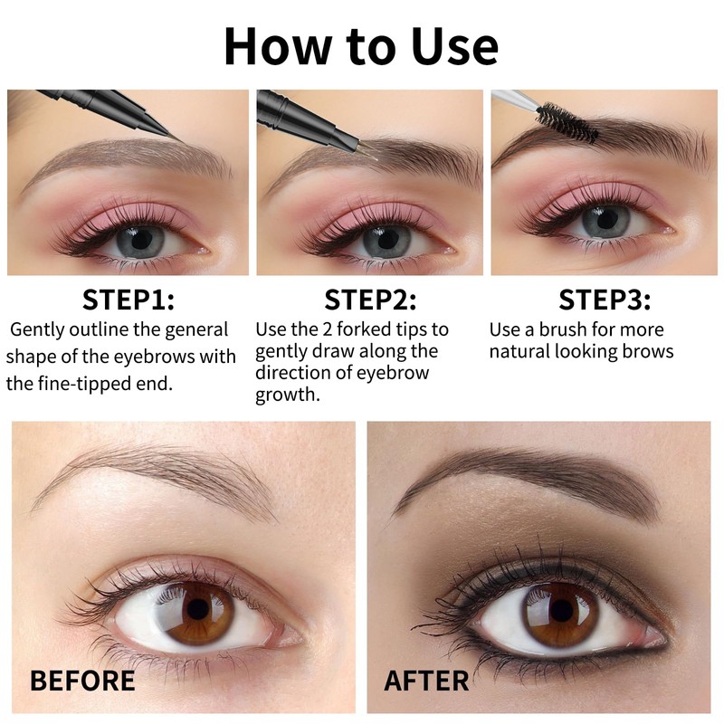 • How to Use: First, use the brow pencil with hair like strokes gently outline the general shape of the eyebrows with the fine-tipped end. Then use the 2 forked tips to gently draw along the direction of eyebrow growth. Create natural eyebrows according to your makeup and add details.