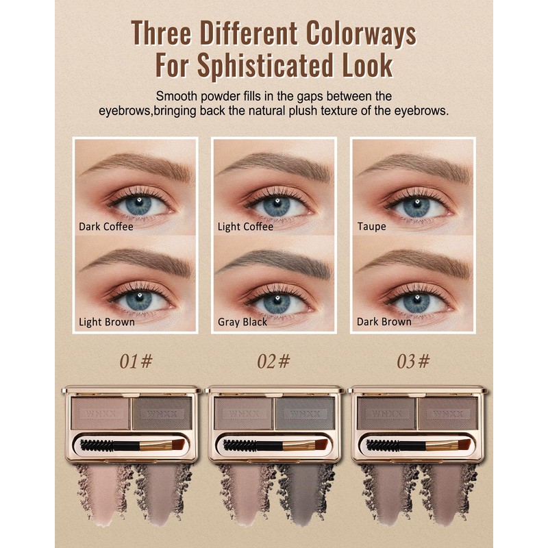 - 2 Colors Eye Brow Palette - With two shades per box to neutralize each other, this brow powder brings together the most used and popular color combinations in 3 collections to choose from. Delicate, soft, smooth and easy to apply, this eyebrow powder adheres to the skin without stickiness, filling in and shaping eyebrows and thickening sparse brows. Saturated colors for a soft, natural look.