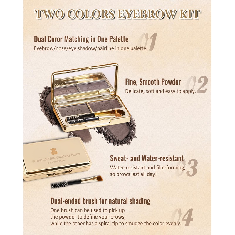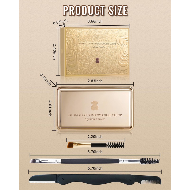 - Tinted Eyebrow Powder Kit - You will receive a 2-color brow powder palette with mini brush, 1 dual-ended brow brush and 1 dual-ended brow shaper. This brow makeup kit comes in a beautiful box with two popular color combinations in each palette. The 2-color brow powder fills in brows, shapes brows and thickens sparse brows. You can match the different colors to your skin tone and overall makeup look to create the perfect brows.