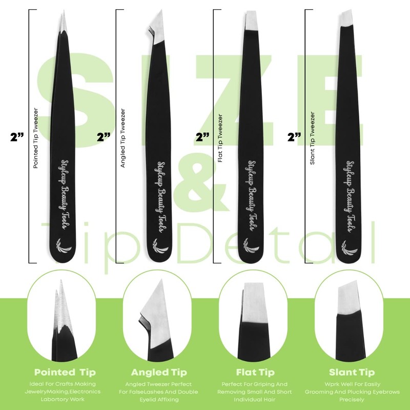 - 4 Practical Tweezers - Different tip shapes included: flat/straight, oblique and pointed; Precision tweezers with different tips remove hair from different parts of the body, which can meet your different needs