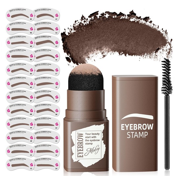 Eyebrow Stamp Stencil Kit - Long-Lasting Eyebrow Powder with Blush, Waterproof & Smudge-Proof Brow Shaping Kit with 24 Reusable Thin & Thick Eyebrow Stencils for Voluminous Brow (Dark Brown)