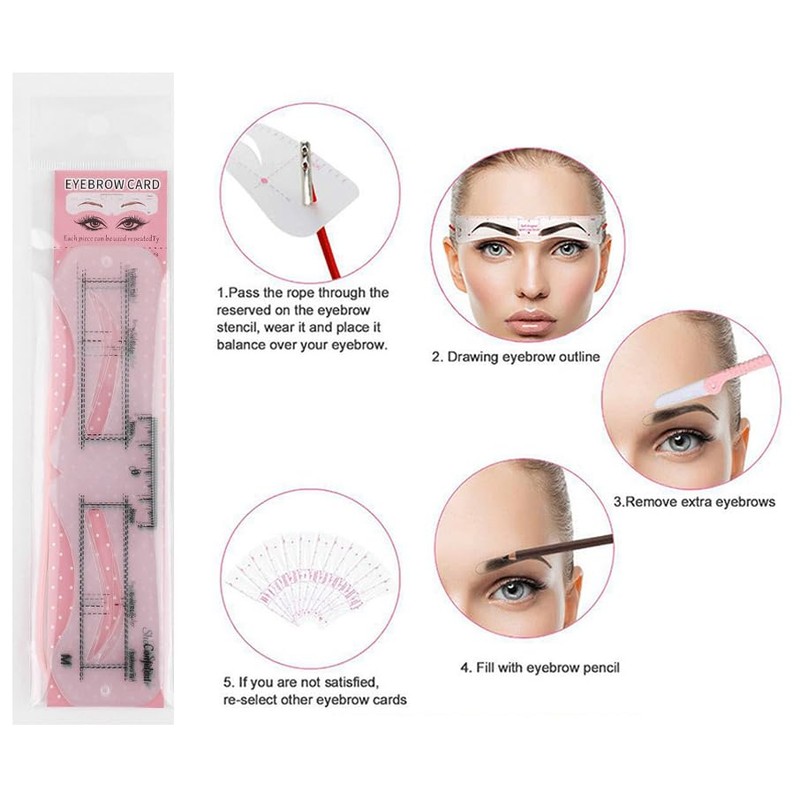 Pass the rope through the reserved on the eyebrow stencil, wear it and place it balance over your eyerow, drawing eyebrow outline, remove extra eyebrows, fill with eyebrow pencil, if you are not satisfied, reselect other eyebrow cards Package includes: 2 sheets face rhinestone stickers,30 styles eyebrow stencils,1 elastic band,1eyebrow tool.