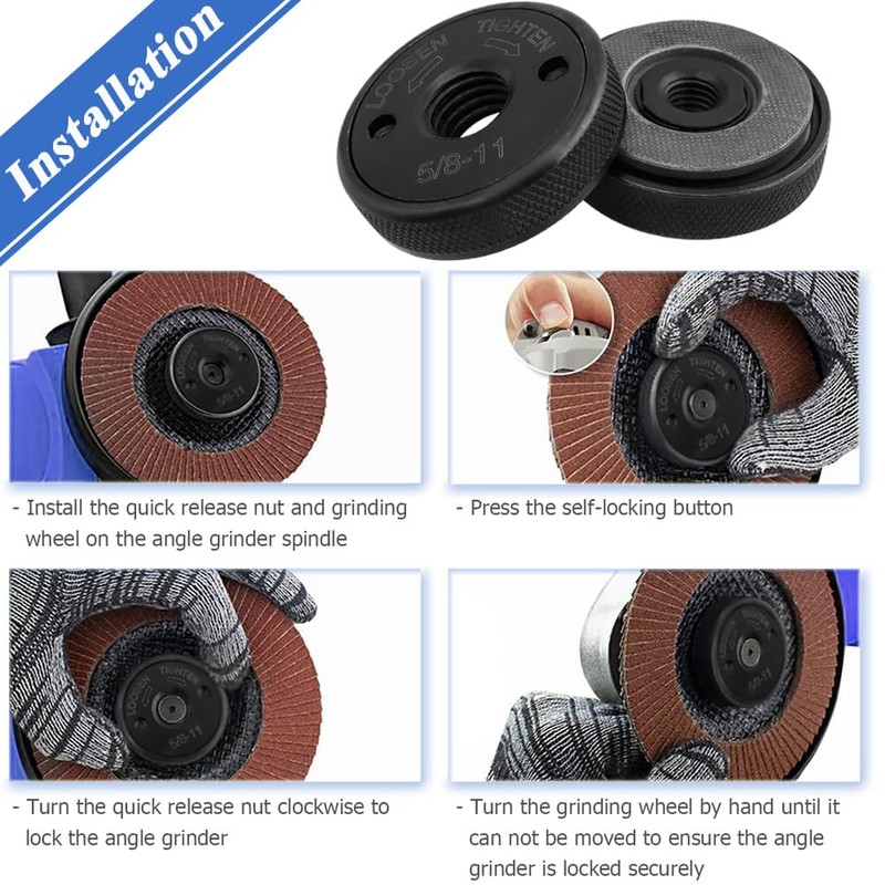 • 5/8"-11 Quick-release Nuts: The quick release angle grinder flange nut enables quick accessories changing without tools, saving your time and efforts.
