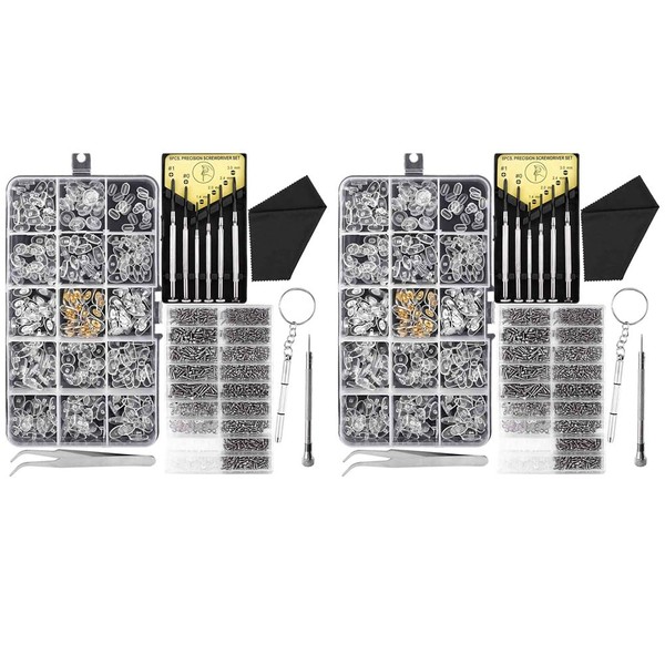 - Eyeglasses repair kit including:a box of 2400 pieces tiny screws, a box of 600 pieces nose pads replacements, 14 pack different sizes precision screwdrivers set, a tweezers, a multi-function mini screwdriver and a cleaning cloth.