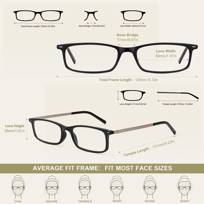 - [ Size Information ] - Lense width: 1.97 inch (50mm), Lens height: 1.02 inch (26mm), Nose bridge width: 0.67 inch (17mm), Arm length: 5.12 inch (125mm),Total Frame Length:131mm (5.23inches)