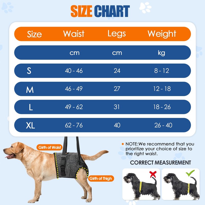 - Harness Object & sizes --- This hind leg support harness is designed for elderly, disabled, arthritic, or hip-dysplastic dogs, and is suitable for dogs weighing 8-40 kg. Please measure your dog’s waist and leg size carefully before purchasing, and refer to the size chart to choose the perfect fit.