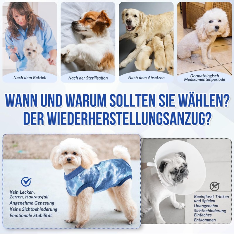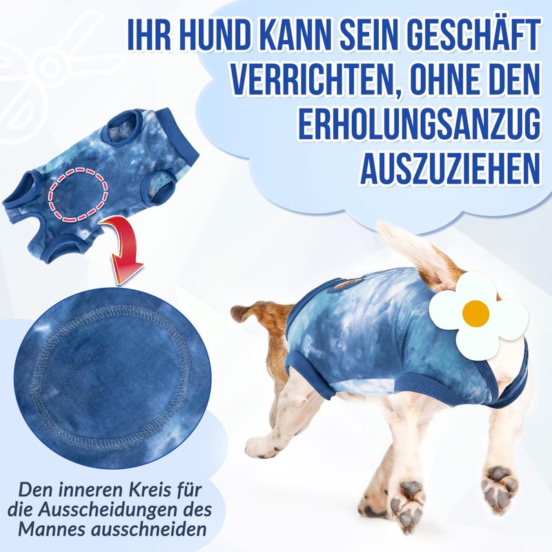 - For male and female pets: Pets can go to the toilet without undressing or getting dirty. PLEASE NOTE BEFORE ORDERING This dog coat is perfect for neutered es, but not for neutered males. We designed a circle at the bottom of the dog's recovery suit, which can be cut open to facilitate physiological needs, and then also remove the cover of the surgical area.