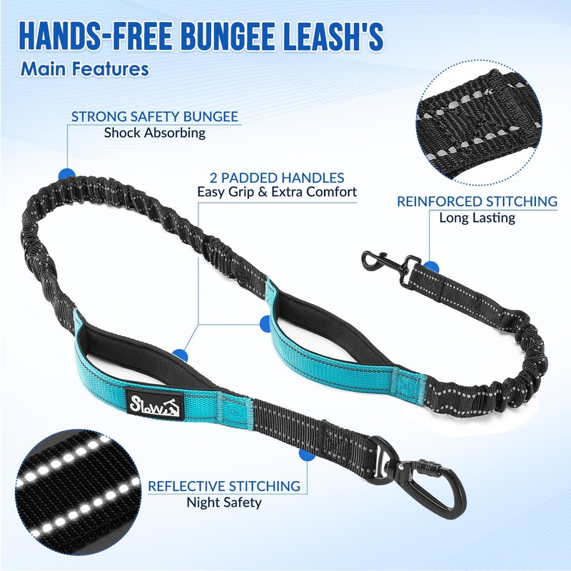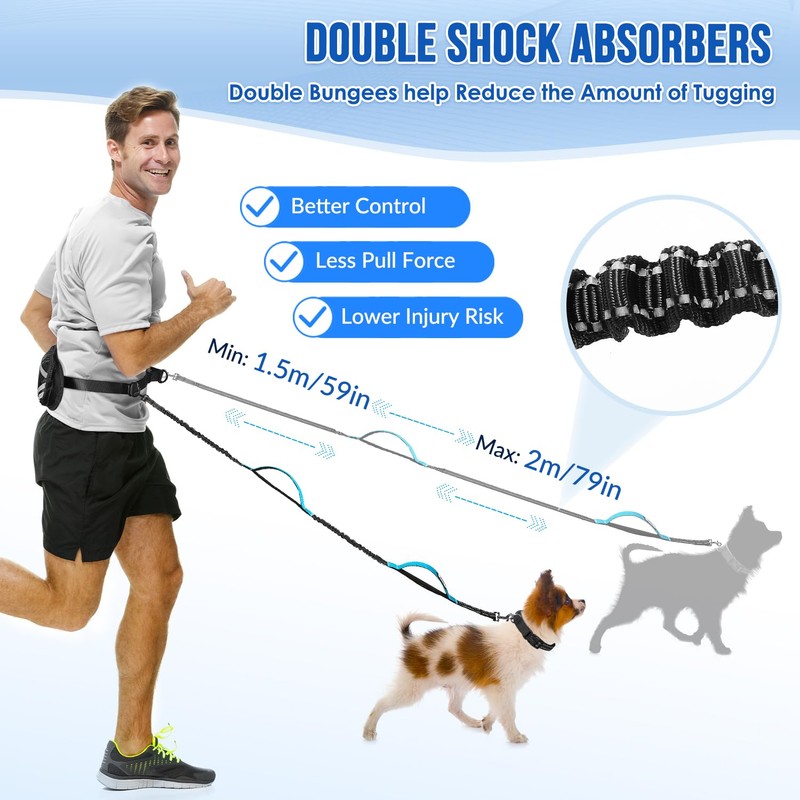 - 【Shock Absorbing & Reflective Stitching Design】The two separate elastic cords in this dog leash absorb the shock and pull of your dog, perfect for leash pullers, giving you more wiggle room without your dog will push you down. Plus, the reflective stitching on the leash and zippered pouch is highly visible at night. And the belt is designed with dual handles, making it easy to quickly control your dog in different positions, so you never have to worry about your dog getting out of control.