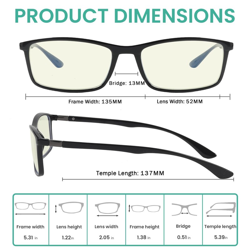 - 【PRODUCTS DIMENSION】Frame material: Plastic, Lens width: 2 1/16"(52mm), Frame width: 5 5/16"(135mm), Lens height: 1 1/4"(31mm), Bridge (DBL): 1/2"(13mm), Temple length: 5 3/8"(137mm), Spring hinge: No, Lenses: Aspheric, Head size: Medium.
