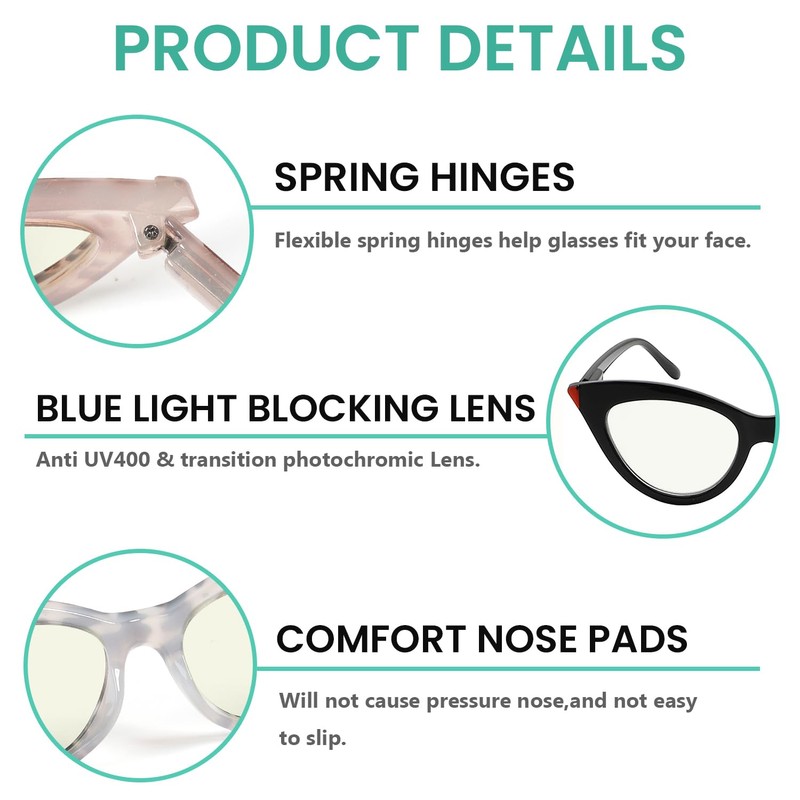 - Eye Protection: The computer reading glasses feature high-definition lenses to protect your eyes from harmful blue light and UV400 rays emitted by screens and devices. These glasses reduce eye strain and discomfort after prolonged screen time.