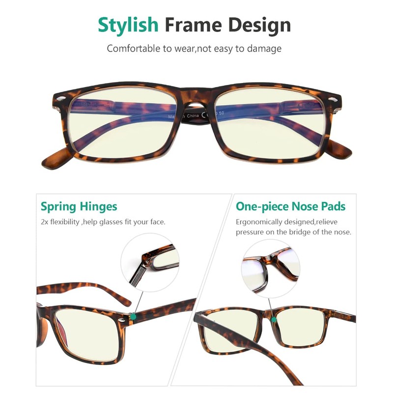 - Spring Hinges Blue Light Blocking Readers - ultra-light and flexible resin frame material for durability and comfortable long-term wearing. Casual frame design keeps you looking cute and stylish while working or playing video games