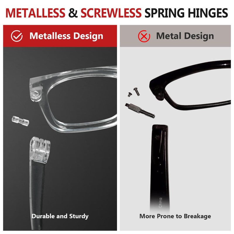 - 【Patented】 - Eyekepper's latest unique METALLESS & SCREWLESS SPRING HINGES design reading glasses combine perfectly with quite ingenious spring hinges, no metal and no screws.
