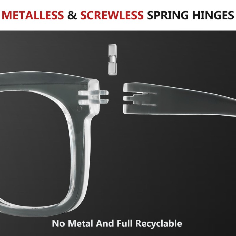 Eyekepper's latest unique design is called METALLESS & SCREWLESS SPRING HINGES, which have no screws or metal innersprings. They're recyclable plastic that don't need any extra processing to remove metal parts prior to the recycling process.