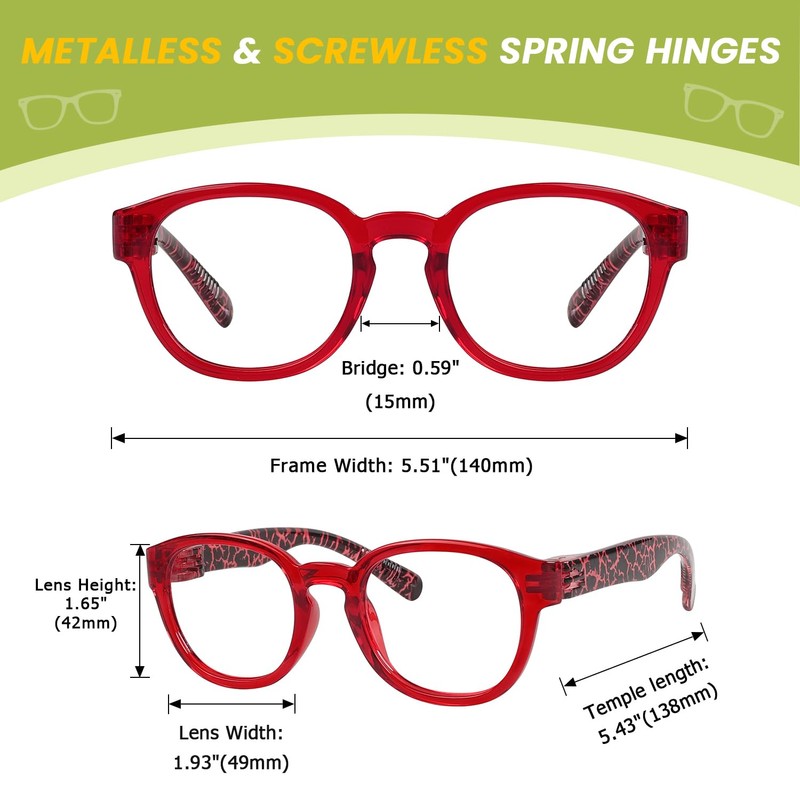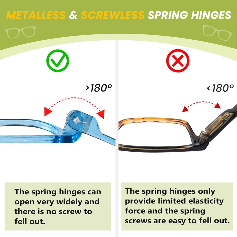 - [Comfortable] The spring hinges without screw of these reading glasses offer great flexibility for the entire frame. Whether your face is narrow or wide, you will not feel any pressure.