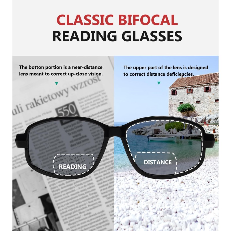 • 【FAR & NEAR IN ONE】EYEKEPPER Bifocal Reading Glasses provide clear vision zones at different distances without having to change glasses frequently.