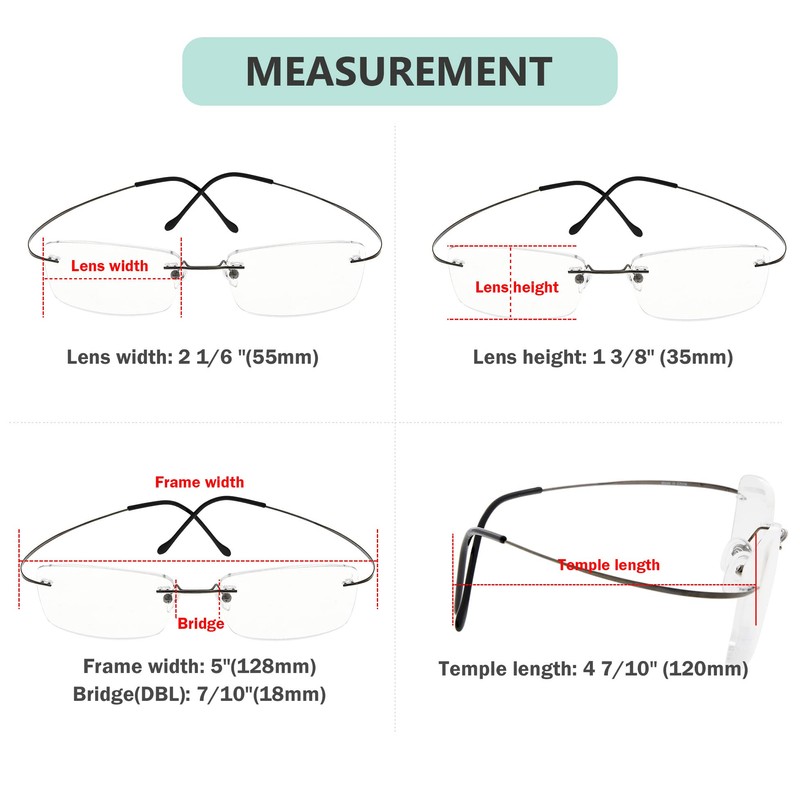 • PRODUCTS DIMENSION-Frame material: metal,Lens width: 2 1/6 "(55mm),Frame width: 5"(128mm),Lens height: 1 3/8" (35mm),Bridge (DBL): 7/10"(18mm),Temple length: 4 7/10" (120mm),Spring hinge:No,Lenses: Aspheric,Head size: Narrow to Medium.
