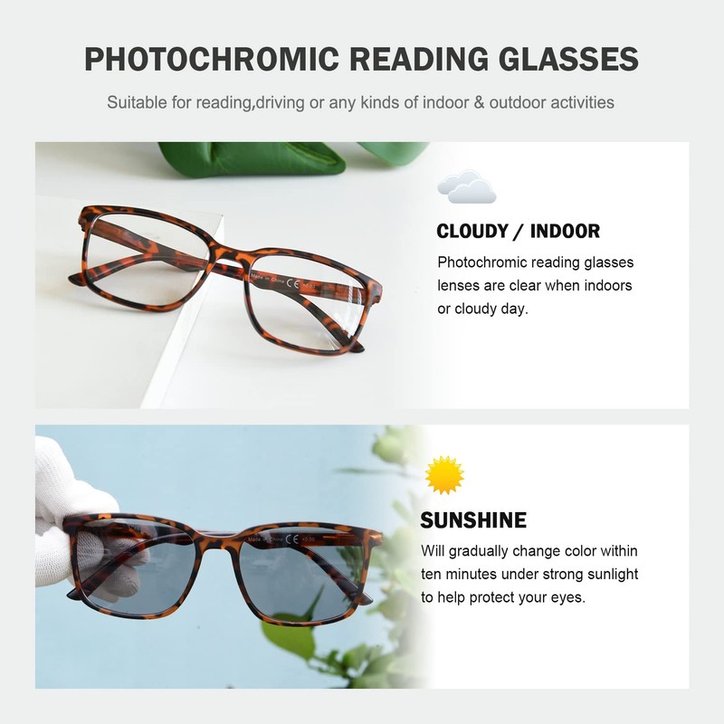 - Lightweight frame with photochromic lenses easy reading indoor and outdoor.