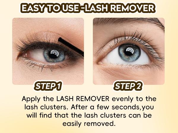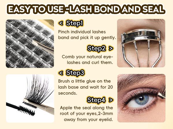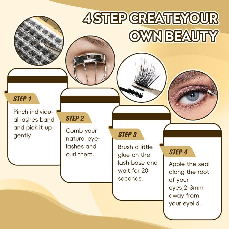 【Easy to Apply】:Firstly,curl your natural eyelash,gently brush your own eyelash with lash glue,then use the tweezers to pick up eyelash extension from the bottom of the false eyelashes,and apply the lash clusters under your natural lashes,finally brush the cluster eyelashes with the lash sealant.