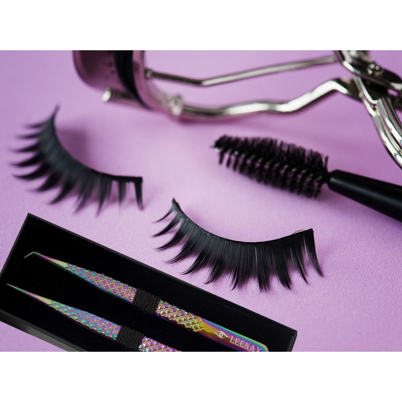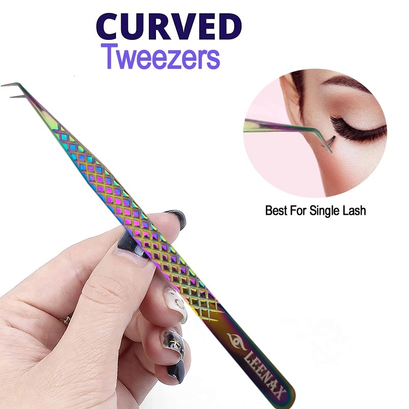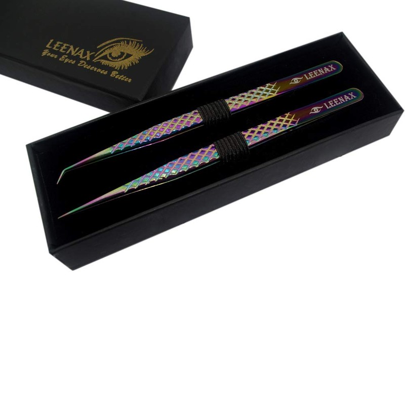 - Leenax: Eyelash Extension Tweezers Set: 2 pieces of Rainbow color tweezers with protective caps in a hard card black case.