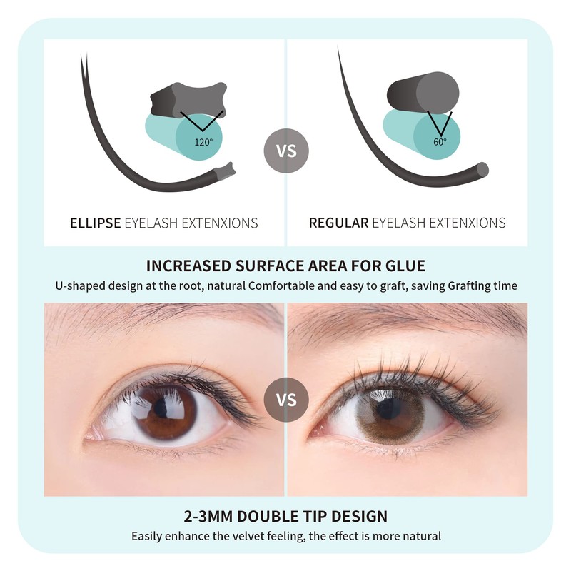 - Softer The elliptical flat eyelash extensions have a unique split tip of their tail, making them 70% lighter than classic eyelashes. It can create the illusion of volume. Comfortable to wear, gentle on natural eyelashes and eyelids. And matte colour is similar to natural eyelashes, no one will even know you have eyelashes