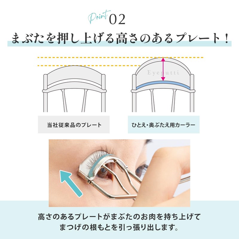 • Point 1: Raised plate that lifts the meat of the eyelid and pulls out the roots of the eyelid. Unique curves and shape focused on Japanese eye size + eyelid thickness