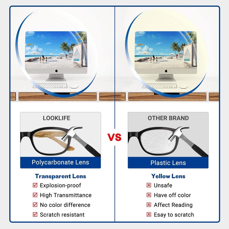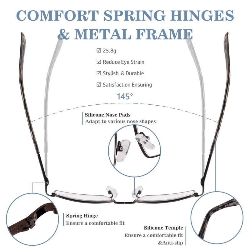 - Comfortable Eyewear: The environmentally friendly tough metal frame ensures that the frame is not easily deformed or damaged. Skin-friendly, allergy-free soft silicone nose pads can reduce the burden on the nose and provide maximum comfort and flexibility.