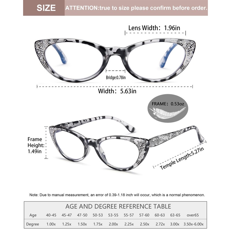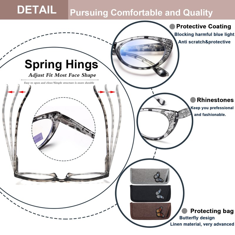 • 👓【Reading Glasses With Adjustable Spring Hinge】Cat eye frame is suitable for round face,oval face,square face and other face shapes.Classic design with adjustable spring hinge let the glasses temples can open up to 25°outwards ,close more smoothly.You can protect your eyes while looking stylish