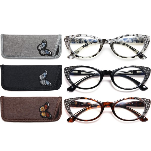 EYEURL 3-Pack Cat Eye Reading Glasses for Women Blue Light Blocking Computer Readers with Rhinestones Anti UV Rays Eyeglasses with Spring Hinges 1.0