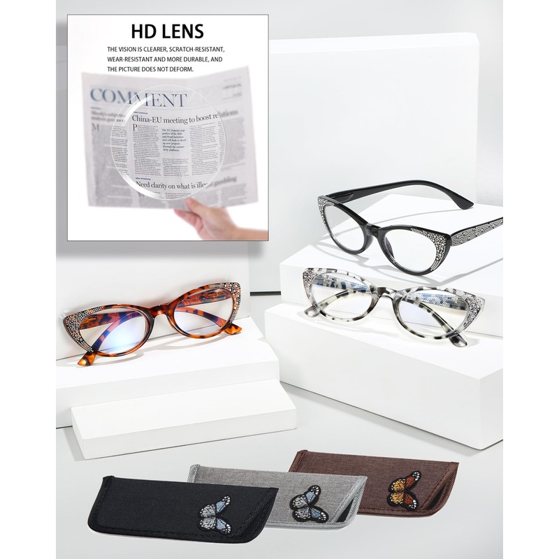 • 👓【3Pack rhinestone cat eye Reading Glasses】These rhinestone reading glasses for women are designed by a professional designer and crafted with exquisite attention to detail, ensuring a high-quality reading experience. Available in four elegant colors, they’re the perfect addition to your wardrobe—giving your look the sophisticated boost it deserves