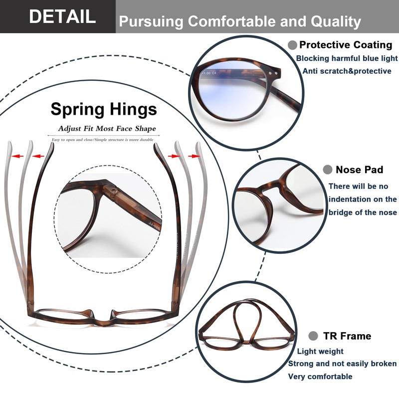 - đăTR90 Lightweight Reading GlassesăThe high quality TR90 frames are made of ultra-durable materials for durability & comfort;you can barely feel its presence,comfortable to wear for a long time.Round classic design,high grade of frames resin lens.EYEURL readers help you decorate your day!