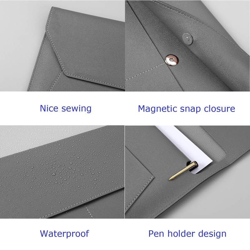 - PRACTICAL DESIGN: Our portfolio envelope is not only a document sleeve and outside has two pockets perfect for your mobile phones, notepads and stationery etc. Total 3 pockets will help you well organize your files. This PU file folder with pen holder design help to get pen easily and secure closure is suitable for safe transport & storage of files and projects. It protects your documents from tearing and other damage.