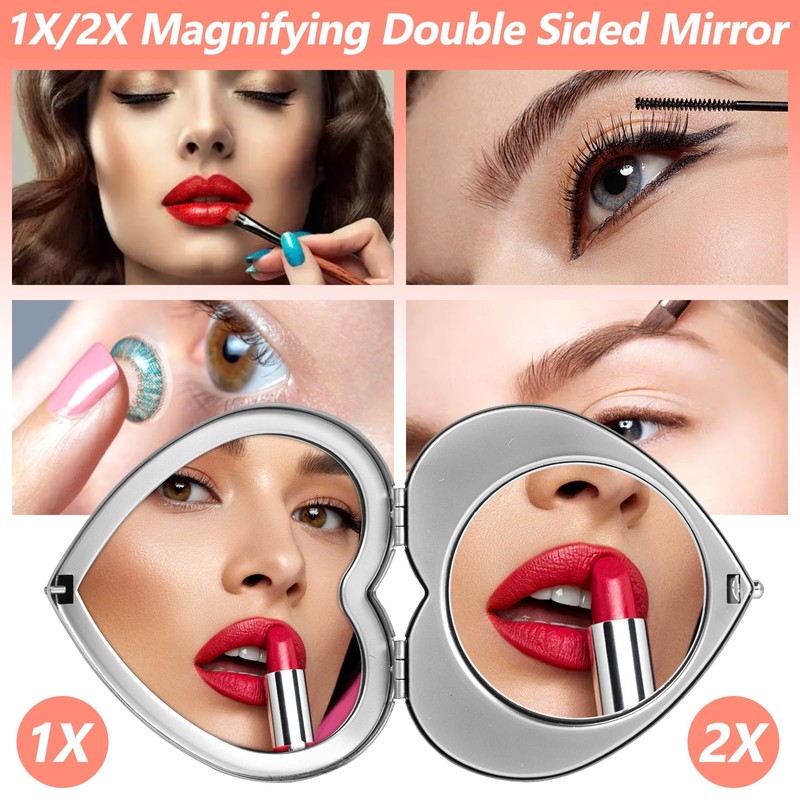 EYIWEITING Mini Heart Compact Mirror,Compact and Beautiful, Portable 1X/2X Magnifier, Sturdy, Perfect for Gifts (Pearl Silver)