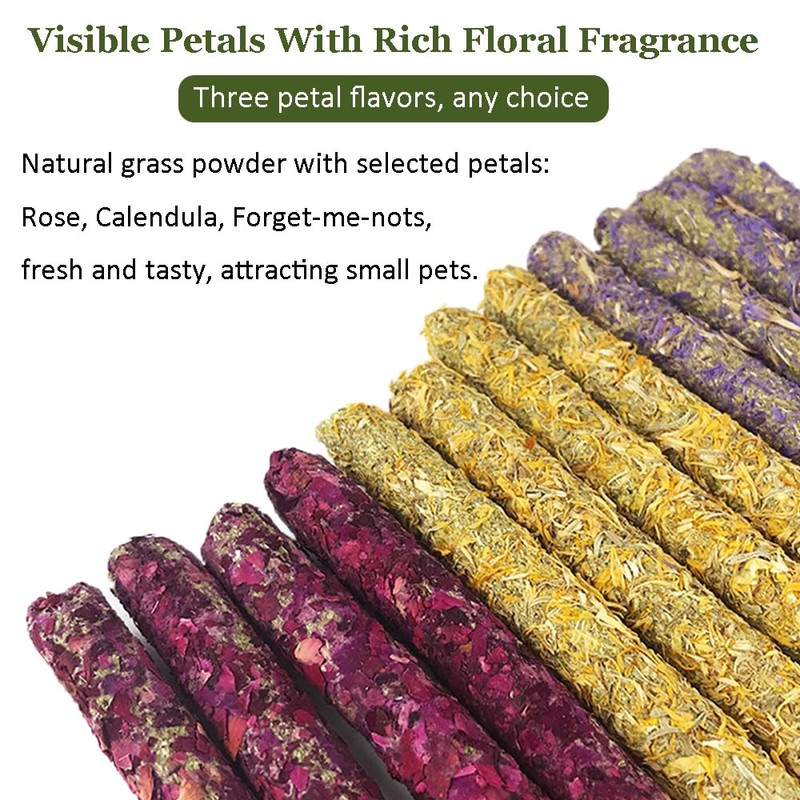 - Package includes: 25 original Timothy hay sticks, 18 hay sticks in three flower flavours (rose, marigold, forget-me-not grass) are packed in two airtight jars for easy storage. Suitable for rodents such as rabbits, hamsters, guinea pigs, chinchillas, gerbils, etc.