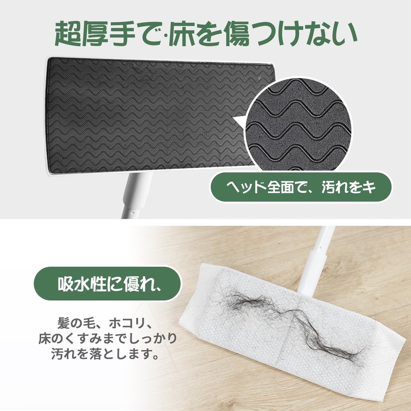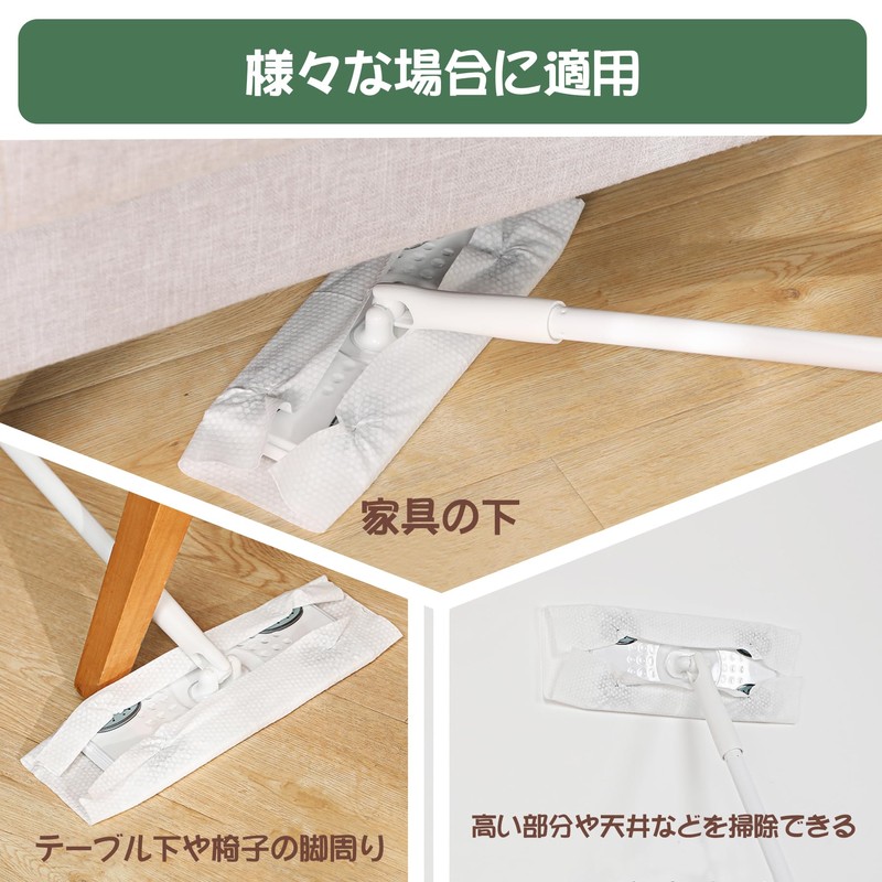 - Basic Information: Product Size: 9.8 x 4.3 x 47.2 inches (25.0 x 11.0 x 120.0 cm). Weight: 460g Set details: Floor wiper x 1; Replacement sheets: 10 sheets. Easy to Use: The head can be rotated 360 degrees, making it lightweight and durable aluminum poles easy to use. The sheet is super thick, and has excellent water absorption and is easy to attract hair and dust. Easy Assembly: Depending on the cleaning location, you can adjust the length of the handle by changing the number of pipes that can be assembled. Easy to assemble and ready to use. Suitable for a variety of situations: Mounting sheets are compatible with both wet and dry sheets. Perfect for tile, marble, laminate, wooden floors, widely used in bathrooms, toilets, bathtubs, windows, ceilings and more