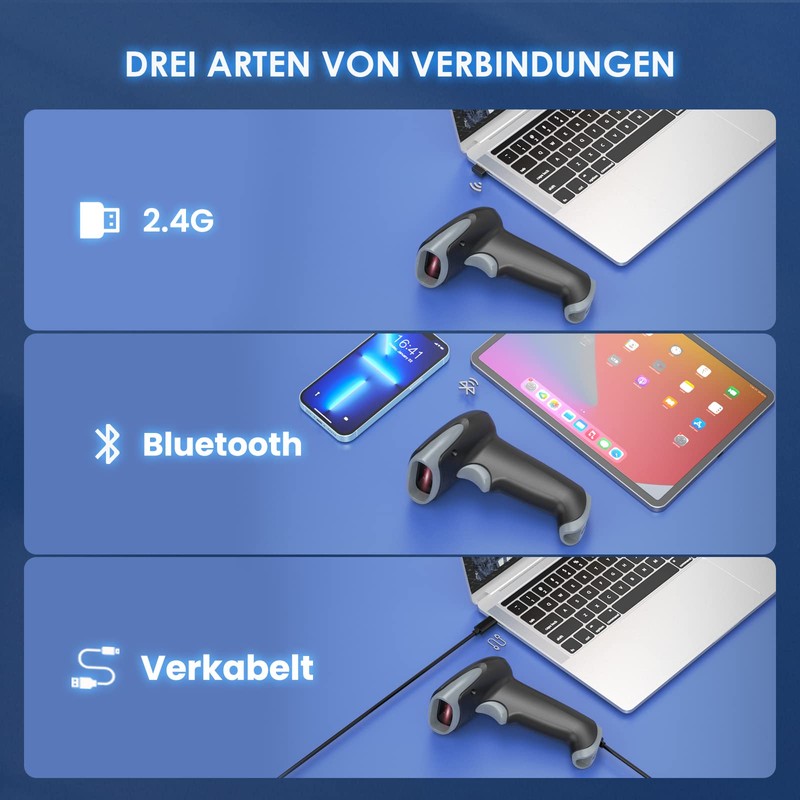 • 3-IN-1 Connection Way: The eyoyo wireless scanner is the easiest pairing on the planet, features a 3-in-1 connection with Bluetooth, 2.4G wireless and USB wired. Its breakthrough design allows your workers for easy transition between corded and cordless operation. Easily adapts to different needs and supports connection with your laptop, PC, MAC, iPhone, Android, smartphone and tablet