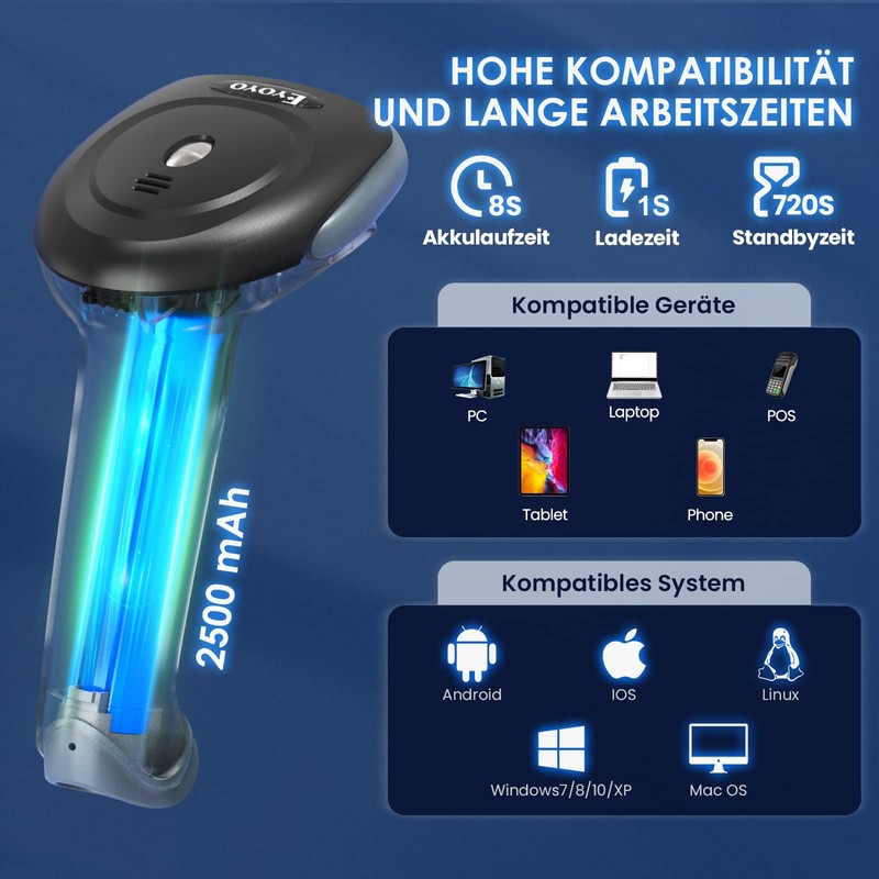 Eyoyo Helps You Achieve Low TOC Features: Easy to use, no need any drivers. Durable and sturdy, the barcode scanner built to survive harsh treatment including 2 m (10 ft) drops, 1,000 1 m (3.3 ft) tumbles, and IP54 sealing. Fast and accurate scanning, speed can up to 220 /sec . The barcode scanner can scan 1d 2d qr barcodes on paper or screen. 2500mAh battery capacity, full charge allows 30 working days if scans 2000 barcodes a day Beep and vibration adjustment, sound or vibration according to you needs.