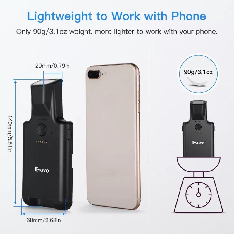 【Phone Back Clip Design】: The Eyoyo Phone Scanner design with only 90g/3.1oz weight and retractable bracket, the barcode scanner can be easily installed on your iPhone and android phones with a length of 5.4-6.5 inches. It is easy to connect with your phone app via Bluetooth, which perfectly solves the problem that the data mobile terminal is too expensive.